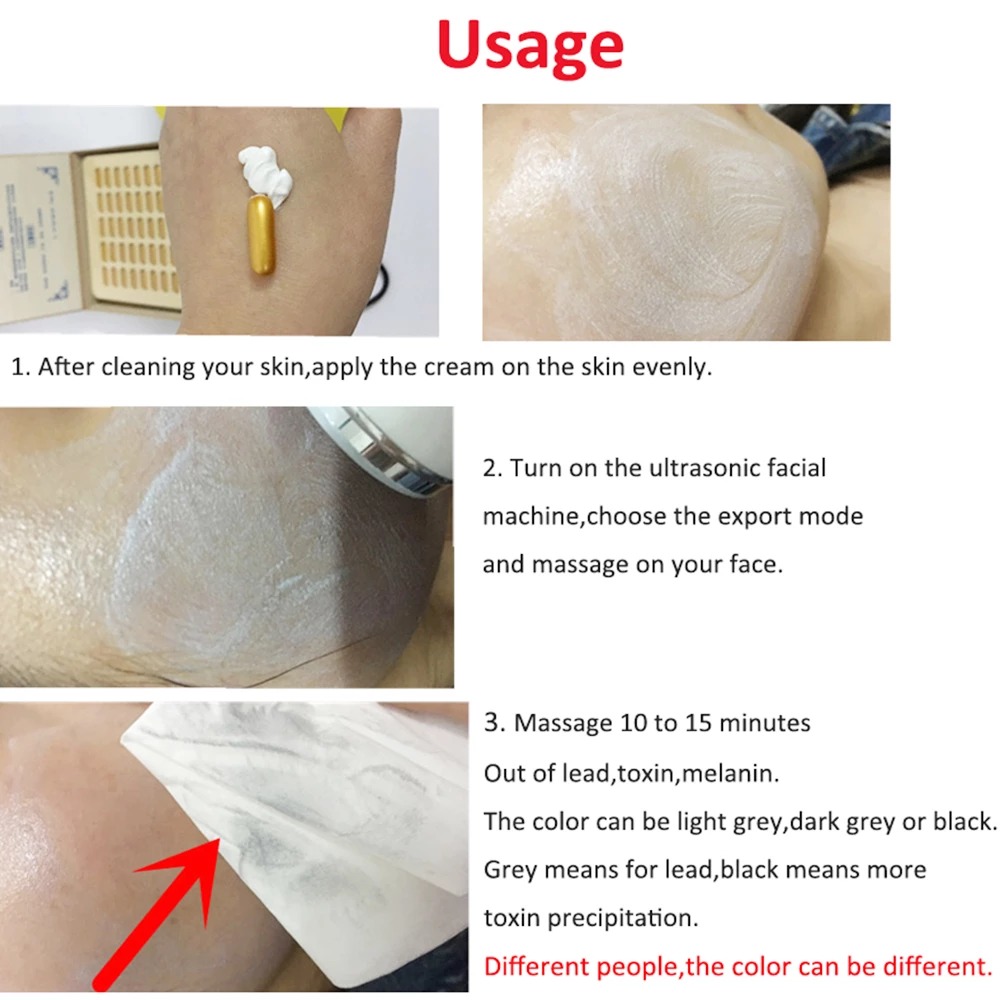 3. The color of the discharged products varies according to each person's skin texture and constitution. It might be light grey,dark grey,black. If too much lead mercury deposition on your face skin,the color of the discharged product will be darker,close to black. If less deposition,the color will be lighter.