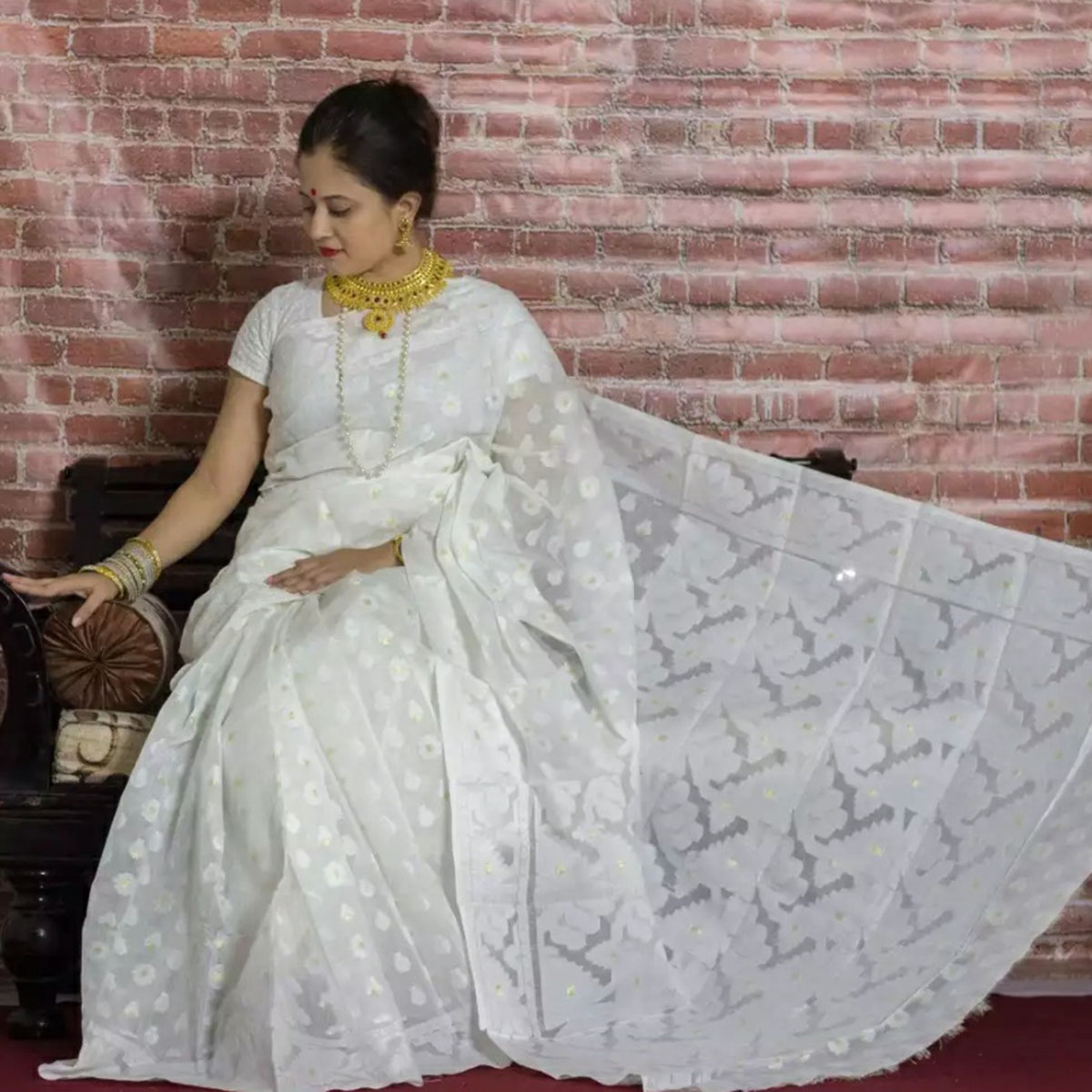 Traditional White Colour Special Tangail Nakful Jamdani Saree For Women.